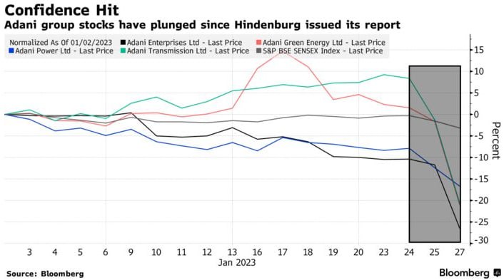 24 января Гинденбург опубликовал отчет, в котором подробно излагаются многочисленные обвинения в корпоративных злоупотреблениях после двухлетнего расследования в отношении компаний магната. Adani Group заявила, что изучает судебный иск после «злонамеренно коварного, неисследованного» отчета трейдера-шортиста. Гинденбург заявил, что полностью привержен выводам своего отчета, добавив, что любые судебные иски, поданные против него, будут беспочвенными, согласно заявлению в Twitter.