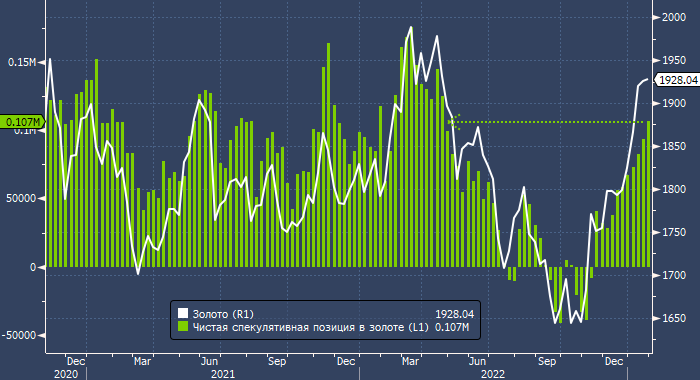 На неделе до 24 января крупные спекулянты (вроде хедж-фондов) увеличили объем чистой длинной позиции во фьючерсах и опционах на золото на 13 274 контракта до девятимесячного максимума в 106 631 контракт, сообщила в пятницу, 27 января, американская Комиссия по торговле товарными фьючерсами (CFTC).