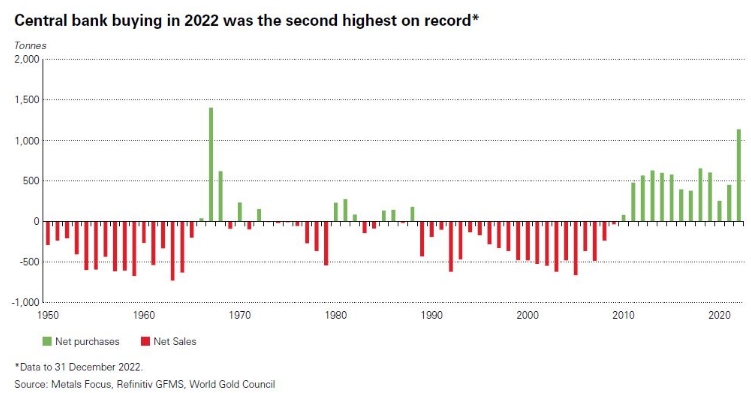 В 2022 году центральные банки добавили к своим запасам колоссальные 1136 тонн золота на сумму около 70 миллиардов долларов, что намного больше, чем за любой год с 1967 года, сообщил во вторник Всемирный совет по золоту (WGC).