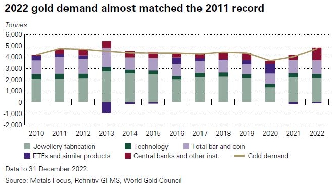 Закупки центральных банков увеличили общий мировой спрос на золото в прошлом году до 4741 тонны, что на 18% больше, чем в 2021 году, и является самым высоким показателем за любой год с 2011 года.