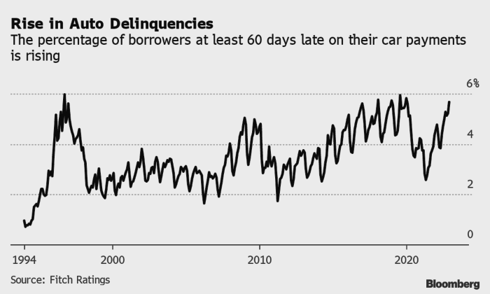Просрочки по автокредитам растут. По данным Fitch Ratings, в декабре процент субстандартных автозаемщиков, которые просрочили свои счета не менее чем на 60 дней, вырос до 5,67% по сравнению с семилетним минимумом в 2,58% достигнутом в апреле 2021 года.