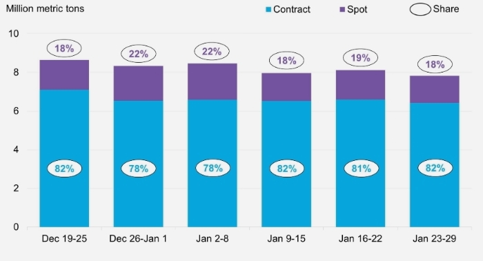 Мировые поставки СПГ составили 7,6 млн метрических тонн за неделю с 23 по 29 января, что на 4% ниже, чем за семь дней до этого. Контрактные поставки сократились на 3%, а спотовые объемы упали на 8%.