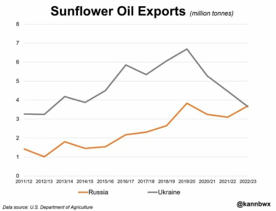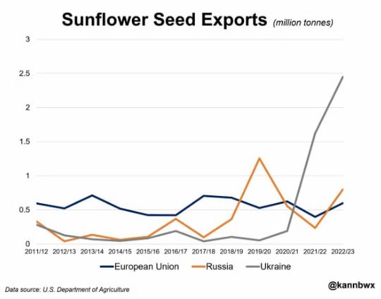 Поскольку деятельность украинских маслоперерабатывающих заводов сильно пострадала от конфликта, экспорт семян подсолнечника резко возрос. Министерство сельского хозяйства США оценивает экспорт подсолнечника из Украины в 2022-23 годах в 2,45 млн тонн, что более чем в 20 раз превышает средние довоенные объемы. Это делает Украину на сегодняшний день крупнейшим экспортером семян, на долю которого приходится 45% мировой торговли по сравнению с менее чем 5% довоенного периода.