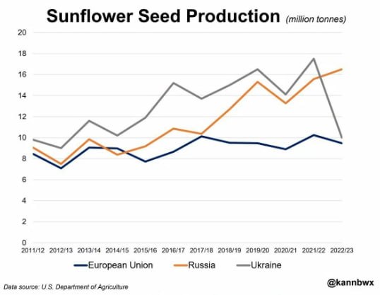 Министерство сельского хозяйства США оценивает урожай подсолнечника в России в 2022 году в рекордные 16,5 млн тонн, что на 6% больше, чем годом ранее, в то время как производство в Украине оценивается в 10 млн тонн, что ниже рекордных 17,5 млн тонн в 2021 году.