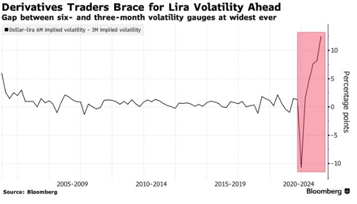 Спрос на защиту от колебаний курса валюты, измеряемый шестимесячной подразумеваемой (вмененной) волатильностью, с начала года вырос больше всего на развивающихся рынках. Это увеличило разрыв с трехмесячным тенором до рекордного уровня, подчеркнув ожидания, что политики сохранят стабильность лиры до выборов в мае.