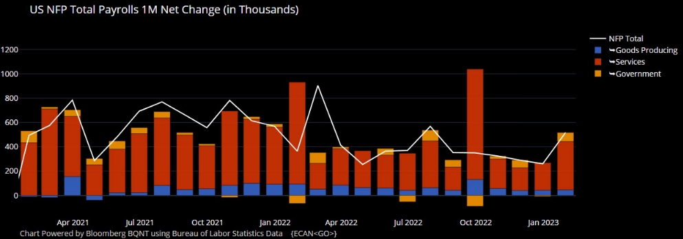 Работодатели в крупнейшей экономике мира добавили 517 000 рабочих мест в январе, что почти вдвое больше по сравнению с начальными 223 000 в декабре. Данные за декабрь были пересмотрены в сторону повышения, чтобы показать добавление 260 000 рабочих мест вместо ранее заявленных 223 000. Несмотря на то, что темпы роста по-прежнему стабильны, шестой месяц подряд наблюдается более медленный рост.