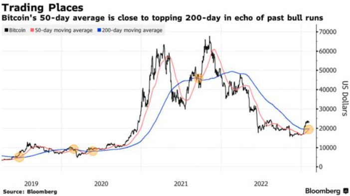 Согласно данным, собранным Bloomberg, за последние пять лет биткойн вырос в среднем на 22% за 60 дней после золотого креста. Но очевидная разница между эпохой легких денег 2020 и 2021 годов, когда некоторые пересечения предшествовали ралли к историческим максимумам, и нынешним фоном заключается в том, что центральные банки повышают процентные ставки для борьбы с инфляцией.