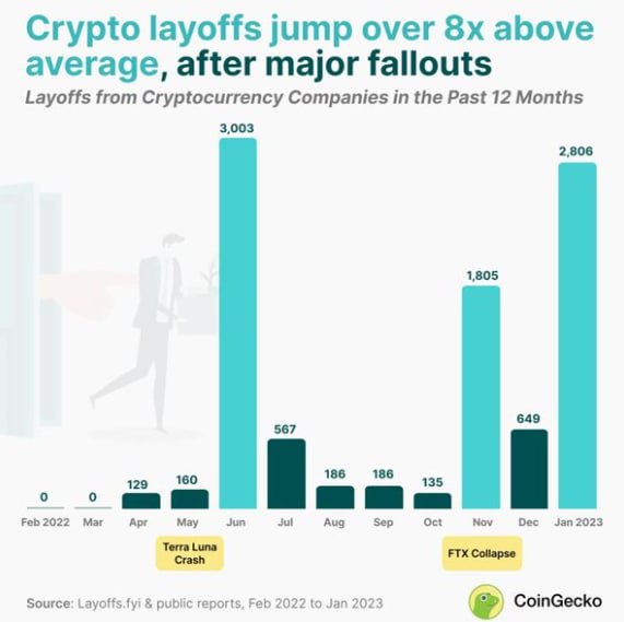 Данные, собранные CoinGecko, показывают, что увольнения в крипто-секторе в январе — почти 3000 человек — были самыми высокими за последний год, если не считать июня 2022 года, когда экосистема TerraUSD была уничтожена на 60 миллиардов долларов.
