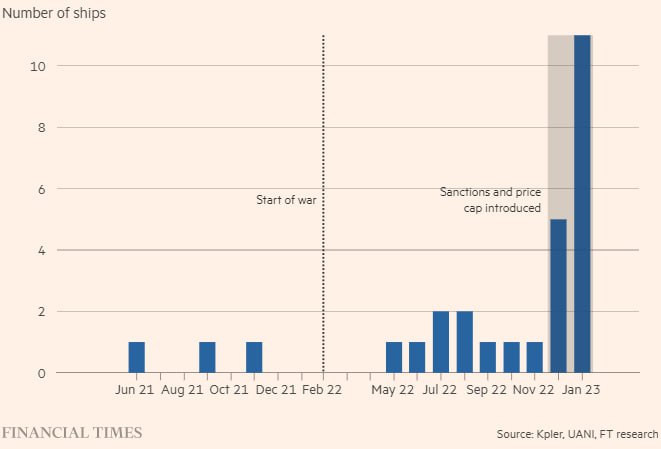 Анализ FT показывает, что объемы российской нефти, отгружаемой на суда, идентифицированные как часть «призрачной флотилии», выросли с менее чем 3 млн баррелей в ноябре до более чем 9 млн баррелей в январе.