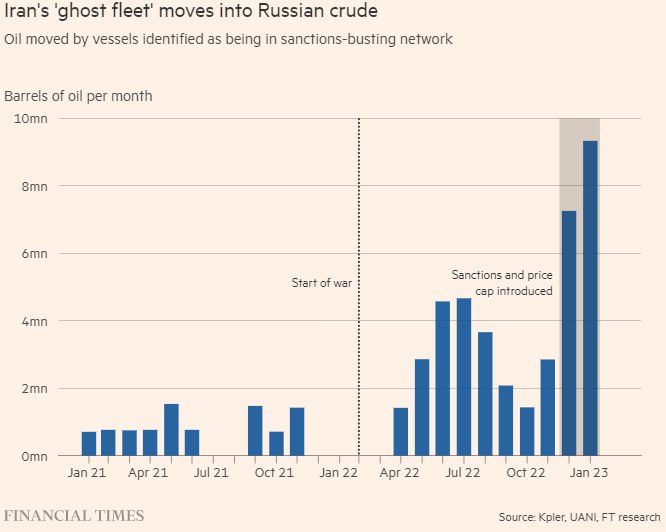 Согласно исследованию Financial Times, по меньшей мере 16 судов, входивших в сеть «призрачной флотилии», которая позволила Ирану нарушить санкции США, за последние два месяца начали отгружать российскую сырую нефть.