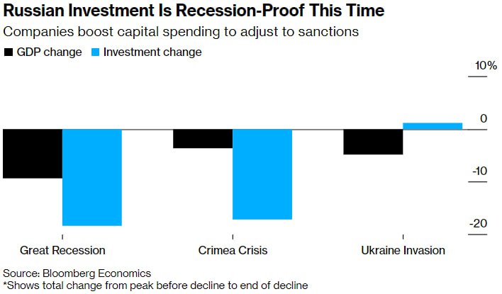 «Российская рецессия не похожа ни на одну из предыдущих. Во время типичного спада больше всего страдают частные инвестиции, в то время как потребление домохозяйств сокращается меньше. Не в этот раз. По нашим оценкам, эта аномалия исчезнет в 2023 году, поскольку высокая неопределенность и риски ведения бизнеса в России сдерживают инвестиции».
