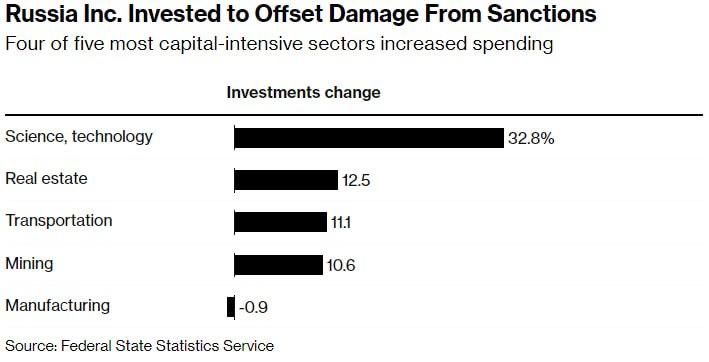 Большие и малые компании тратили деньги на замену иностранного оборудования и программного обеспечения или направляли деньги на создание новых цепочек поставок для выхода на альтернативные рынки. По данным Bloomberg Economics, столкнувшись с первоначальными прогнозами снижения капитальных затрат до 20%, в 2022 году в России вместо этого они увеличились на 6%.