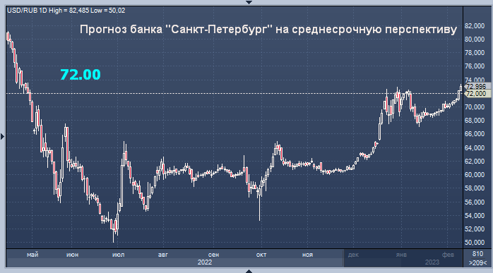 Вероятно ослабление рубля до 72 руб./$1 в среднесрочной перспективе, считают в банке "Санкт-Петербург".