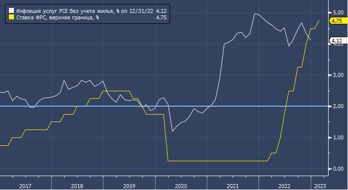 Динамика инфляции услуг PCE за исключением жилья, верхней границы ставок ФРС и цель ФРС на уровне 2%.