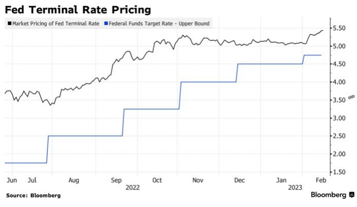 В декабре члены правления Федеральной резервной системы в среднем прогнозировали пик ставок на уровне 5,1% в этом году, но фьючерсные рынки на процентные ставки сейчас оценивают пик выше 5,2%, а представители ФРС во вторник перешли на ястребиный тон.