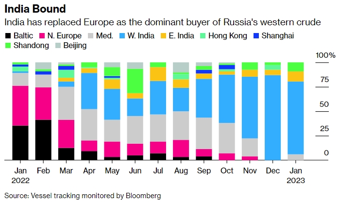 Индия заменила Европу в качестве основного покупателя российской западной нефти. Источник: отслеживание судов, контролируемое Bloomberg.
