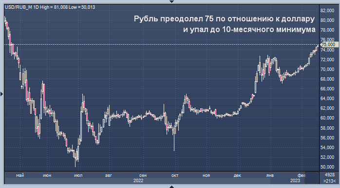 Российский рубль упал до уровней выше 75 по отношению к доллару в пятницу, продолжив недавнюю тенденцию к ослаблению, вызванную эмбарго на российские нефтепродукты и устойчивым восстановлением импорта, что повысило спрос на иностранную валюту.