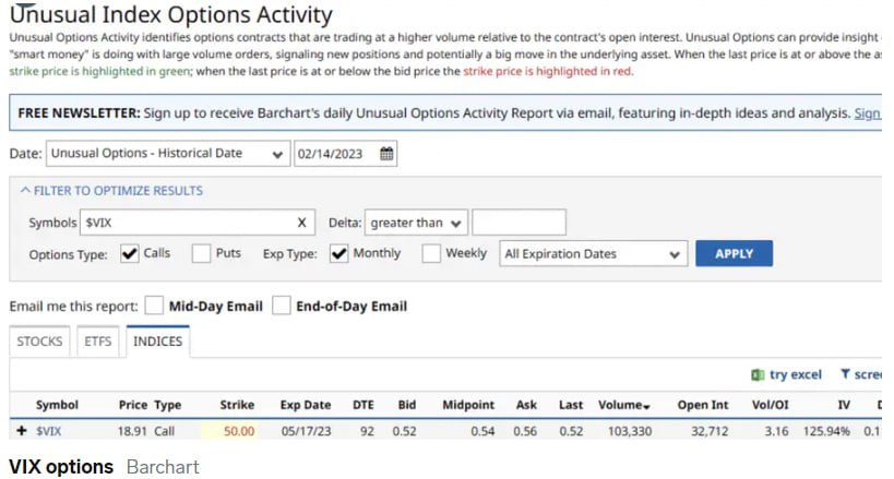 Привлекает внимание последний раунд покупок таинственного игрока или нескольких игроков. Barchart, поставщик котировок и других рыночных данных, указал, что кто-то поздно вечером во вторник купил 100 000 колл-опционов по 0,50 доллара каждый, поставив 5 миллионов долларов на то, что VIX вырастет до 50 в мае.