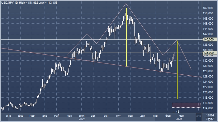Быки по иене, которых, кажется, много, вновь появляются на 135 за доллар, уровне, на котором опционы на сумму более 3 миллиардов долларов экспирировались в пятницу. Доллар/иена может вырасти, но должна оставаться ниже 140, чтобы медвежья фигура «голова и плечи» сигнализировала падение курса до 115.