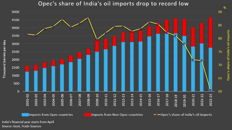 Увеличение закупок российской нефти привело к сокращению индийского импорта с Ближнего Востока до рекордно низкого уровня в 48%, а страны - члены Организации стран-экспортеров нефти (ОПЕК) сократили поставки до самого низкого уровня за всю историю, показали данные.