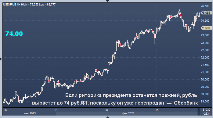 "В центре внимания в течение дня будет послание президента РФ Федеральному собранию. Если его риторика останется прежней, то рубль может восстановиться до 74 руб./$1, поскольку на текущих уровнях российская валюта выглядит перепроданной", - указывают экономисты Сбербанка.