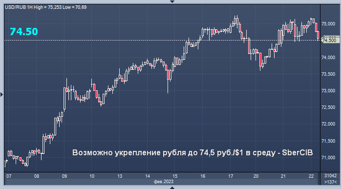 Возможно укрепление курса рубля по отношению к доллару США до уровня 74,5 руб./$1 на торгах в среду, пишут аналитики SberCIB Investment Research.