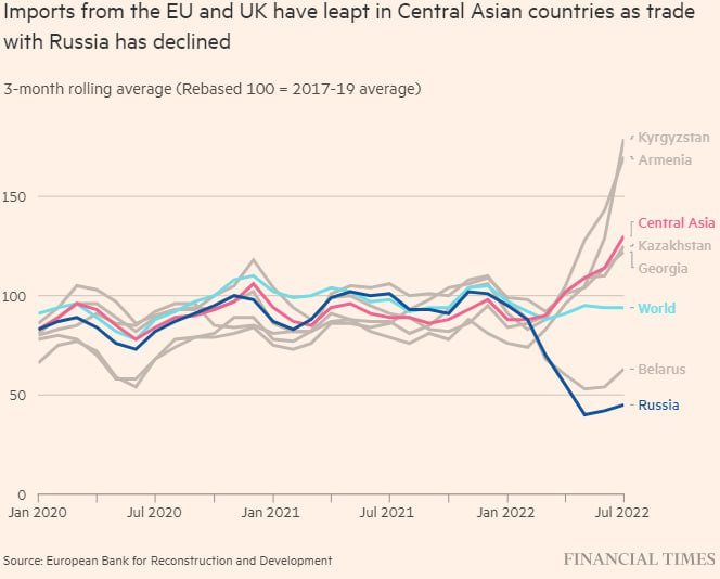Согласно анализу Европейского банка реконструкции и развития, Армения и Кыргызстан входят в число стран с резким увеличением западного импорта и экспорта в Россию. Экспорт Турции в Россию также вырос.