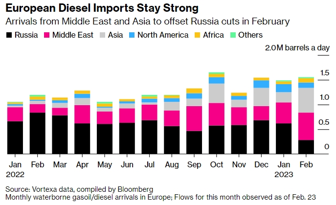 Европа смогла импортировать большие объемы дизельного топлива в феврале даже после введения санкций в отношении закупок в России, которая была ее главным внешним поставщиком до начала этого месяца.