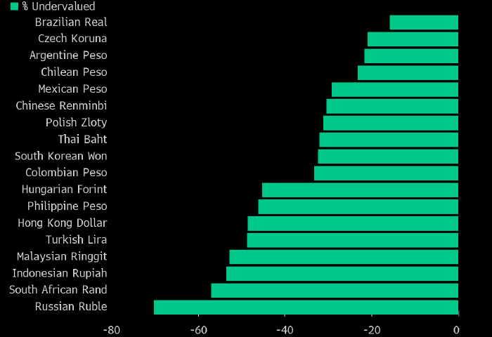 Недооцененность валют EM по индексу «Бигмака» в %. Источник: Bloomberg