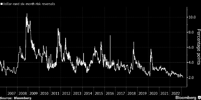Шестимесячные «risk reversals» в USDZAR. Источник: Bloomberg