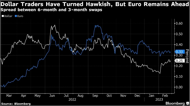 В последние месяцы доллар внимательно следил за спредом между шестимесячными и трехмесячными свопами. Это хороший показатель того, насколько ястребиными являются трейдеры — в какой степени, по их мнению, центральный банк все еще будет в режиме повышения ставок через три месяца.
