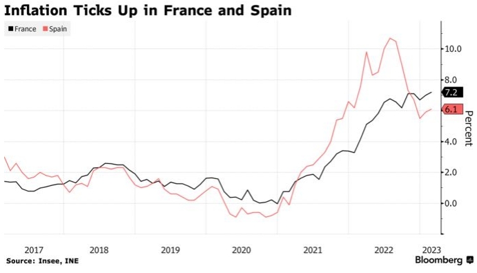 Потребительские цены во Франции подскочили на рекордные 7,2% по сравнению с прошлым годом из-за роста цен на продукты питания и услуги. В Испании рост составил 6,1%. Аналитики ожидали, что рост цен останется неизменным на уровне 7% во Франции и замедлится в Испании.