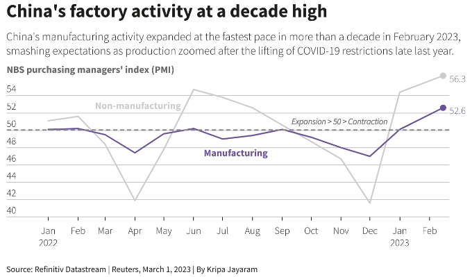 Производственная активность Китая выросла самыми быстрыми темпами более чем за десятилетие в феврале, показал официальный индекс в среду, превзойдя ожидания, поскольку производство увеличилось после отмены ограничений на COVID-19 в конце прошлого года.