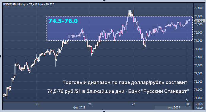 Торговый диапазон по паре доллар/рубль, скорее всего, составит в ближайшие дни 74,5-76 руб./$1, по паре евро/рубль - 79-80,5 руб./EUR1, считает директор департамента операций на финансовых рынках банка "Русский Стандарт" Максим Тимошенко.