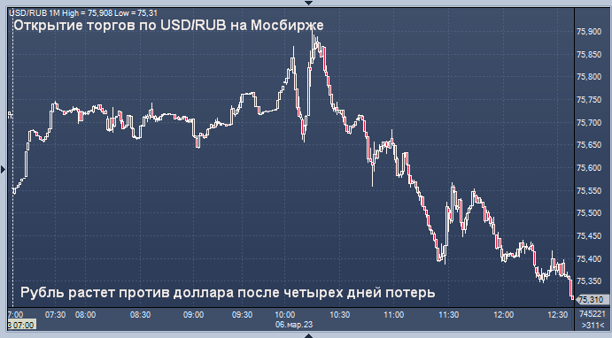 Российская валюта открывает сокращенную неделю ростом по отношению к доллару США, готовясь прервать четыре сессии снижения. Акции настроены на рост в течение второго дня. Рубль прибавляет 0,3% на московских торгах до 75,4325/$.