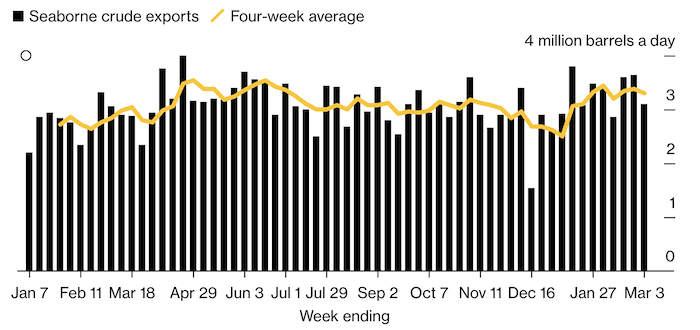 Поставки нефти за неделю до 3 марта сократились на 526000 баррелей в сутки по сравнению с предыдущей неделей. В среднем за четыре недели общий объем морского экспорта уменьшился на 80000 баррелей в сутки до 3.3 млн баррелей в сутки.