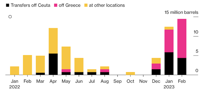 Грузы по-прежнему перемещаются с судна на судно в Средиземном море. Это наиболее заметно в испанском городе Сеута на североафриканском побережье, а также на греческом побережье близ Каламаты. С начала года между судами в этих двух местах было перемещено минимум 37 партий груза. Перемещенный объем у побережья Греции, в основном в заливе Лаконикос, резко возрос в феврале, превысив 10 млн баррелей, что эквивалентно 360000 баррелей в сутки. В районе Сеуты перемещается 4.4 млн баррелей, что эквивалентно 156000 баррелей в сутки.