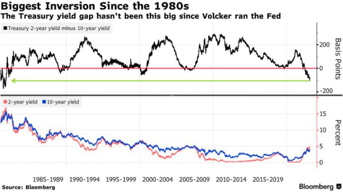 В США спрэд между доходностью 2- и 10-летних облигаций показывает дисконт, превышающий процентный пункт, впервые с 1981 года, когда тогдашний председатель ФРС Пол Волкер добивался повышения, чтобы справиться с двузначной инфляцией. Индикатор инверсии доходности на протяжении десятилетий предсказывал рецессии в результате агрессивных кампаний ужесточения ДКП ФРС.