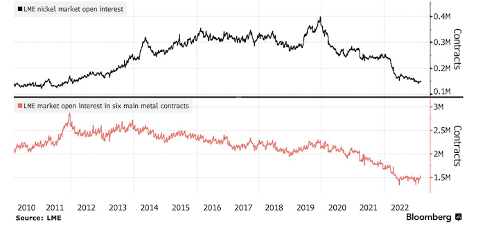 После кризиса рынок никеля на LME был открыт только в часы европейских торгов, и одной из важных мер для оживления активности станет долгожданное возобновление торгов в часы работы азиатских рынков в этом месяце. Но пока нет уверенности, что работа рынка в течение более длительного периода повысит активность, поскольку торговля на конкурирующем шанхайском рынке никеля также сократилась с момента кризиса.