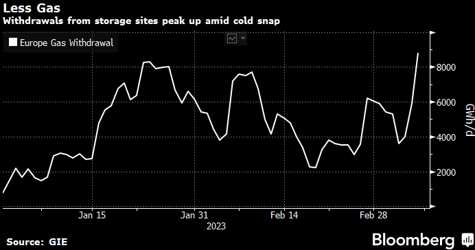 Запасы, вероятно, будут истощаться еще больше из-за прогнозируемых температур ниже среднего в ближайшие дни, и слишком резкое снижение затруднит их пополнение летом, особенно в отсутствие обычных объемов российского газа. Тем не менее, подземные хранилища в настоящее время заполнены намного больше, чем в среднем за пять лет для этого времени года, обеспечивая сильный буфер для любого скачка спроса. В то время как резкое похолодание в последние несколько недель в конце в основном мягкой зимы оказывает давление на энергетическую инфраструктуру, возможная нехватка электроэнергии не вызывает беспокойства.