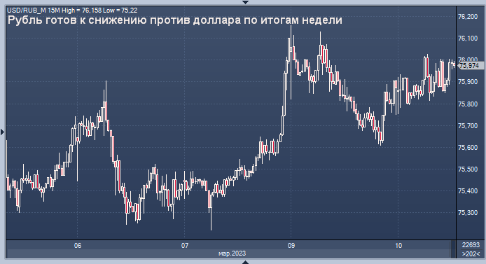 Рубль ожидает недельное снижение по отношению к доллару США, так как цены на нефть падают на фоне опасений по поводу темпов ужесточения денежно-кредитной политики в США. Российские акции падают вторую сессию. Котировка рубля в ходе торгов в Москве практически не изменилась на уровне 75,8850/$, что означает снижение на 0,3% за неделю, сокращенную выходным днем. Рубль подешевел на 0,1% по отношению к евро до 80,3475, снизился на 0,4% по отношению к юаню до 10,9040.