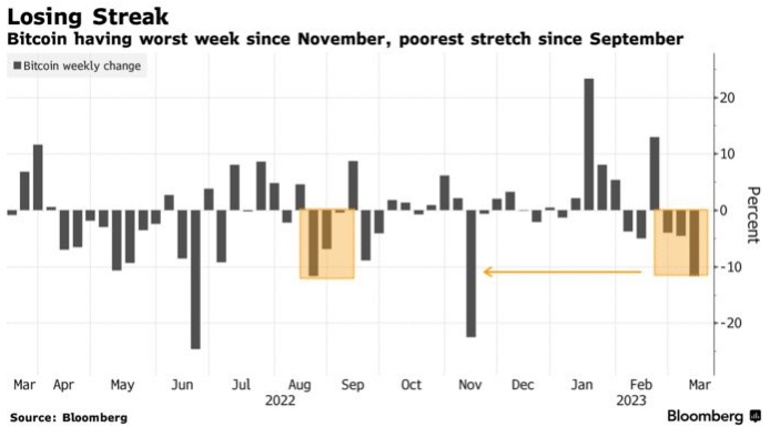 На этой неделе биткойн потерял около 12%, что является максимальным с момента недельного падения на 23% в ноябре на фоне краха платформы FTX Сэма Бэнкмана-Фрида.