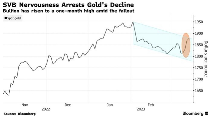 SVB Нервозность остановила падение золота | Слитки поднялись до месячного максимума на фоне последствий