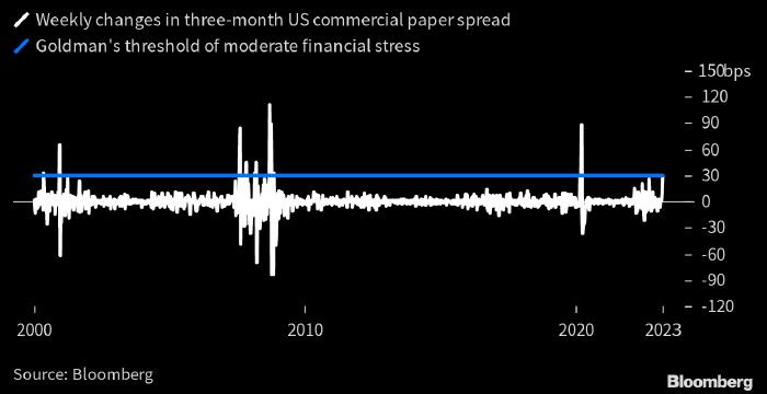 Оглядываясь назад на данные за период с 2000 по 2022 год, Goldman обнаружил, что до тех пор, пока стресс кажется умеренным — т. е. когда спреды трехмесячных американских корпоративных облигаций к трежерис подскакивают на 20–30 базисных пунктов — доллар имеет тенденцию дешеветь против валют G-10.