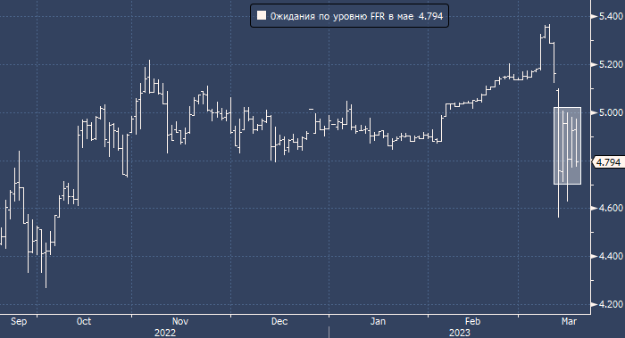 Рынок фьючерсов на ставку по федеральным фондам продолжает ставить на то, что 22 марта ФРС повысит ее на 25 б.п. Вероятность такого события оценивается в 62%, а вероятность сохранения статус-кво — в 38%. Ожидания по пиковому уровню ставки — предполагается, что он будет достигнут в мае — продолжают прыгать, но уже внутри сформировавшегося диапазона 4,75–5,00%.
