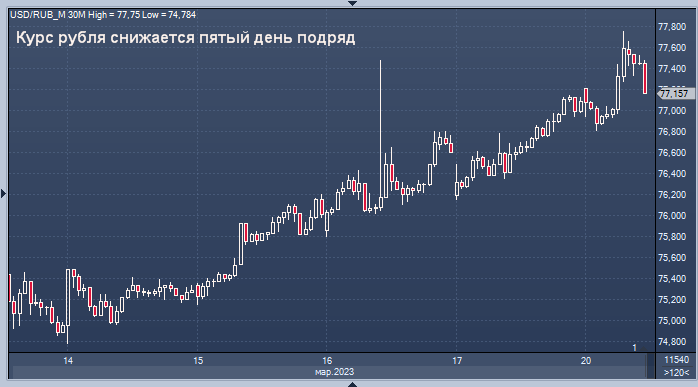 Российская валюта слабеет по отношению к доллару на фоне падения цен на нефть. Индекс акций готов подняться на вторую сессию. Рубль снижается на 0,5% на торгах в Москве до 77,4600, самого низкого уровня закрытия 19 апреля.