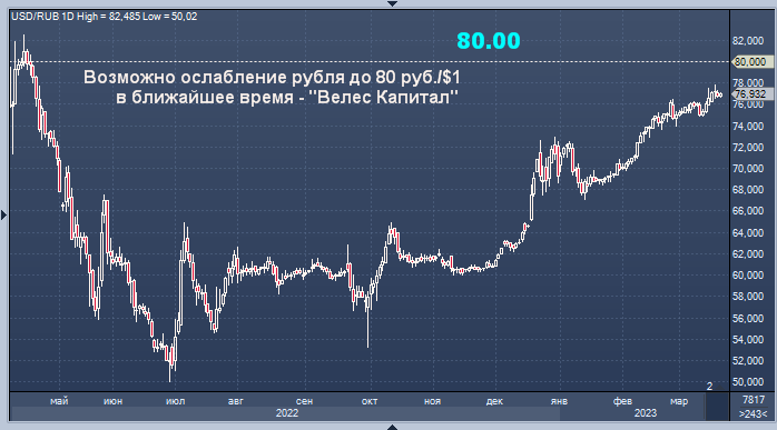 Аналитик инвестиционной компании "Велес Капитал" Юрий Кравченко представил свои аргументы идей дальнейшего ослабления рубля. Технические факторы: в феврале и марте курс доллара обновлял максимумы предыдущих месяцев. Как гласит главный закон теханализа: тенденция, скорее, продолжится, чем изменится. Новые максимумы и новые минимумы означают, что восходящая тенденция остается в силе. Эксперт не исключает аналогичной ситуации в апреле. Мартовский максимум находится на уровне 77,76 руб./$1. Его прорыв станет сильным бычьим сигналом.