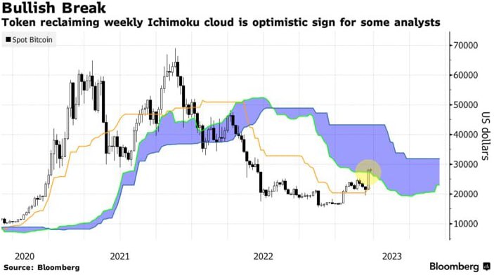 Биткоин прыгнул в область, отмеченную на недельном графике облаком Ишимоку, индикатором, который использует математические формулы для определения уровней сопротивления и поддержки. Прорыв в облако сигнализирует о возможности дальнейшего роста. Токен может «использовать банковский кризис в качестве средства хеджирования» и получать помощь от центральных банков, вынужденных вливать ликвидность для преодоления колебаний банковского сектора, написал в заметке Бендик Шей, руководитель отдела исследований K33.