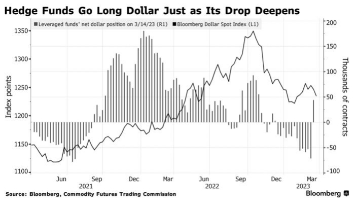 «Многие, в том числе некоторые хедж-фонды, оказались в ловушке из-за отсутствия спроса на доллар как убежище на фоне проблем региональных банков США», — сказал Родриго Катрил, старший валютный стратег National Australia Bank Ltd. в Сиднее. «Ожидания смягчения политики ФРС превосходят другие факторы» и ухудшают перспективы доллара, добавил он.