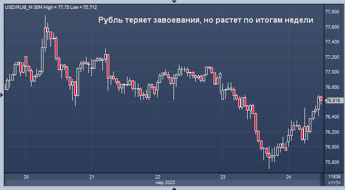 "Рубль в четверг заметно укрепился на фоне усилившихся продаж валютной выручки компаниями-экспортерами для уплаты мартовских налогов, - пишут эксперты. - Поддержку рублю оказывают и выросшие с годовых минимумов цены на нефть. В пятницу курс USD/RUB находится у 76,2 руб./$1. Другие валюты EM с утра также преимущественно слабеют. Фактор налогового периода сегодня продолжит оказывать рублю поддержку, и курс USD/RUB, вероятно, не превысит 77 руб./$1", - пишут аналитики банка "Санкт-Петербург".